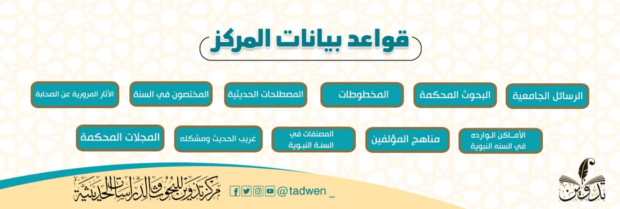 أصبح بإمكان طلاب وطالبات الدراسات العليا في السنة وعلومها الاستفسار عن موضوعات الرسائل العلمية والتي يرغبون في تسجيلها في جامعاتهم؛ من خلال قواعد بيانات مركز تدوين؛ أو بالتواصل مع المركز من خلال البريد الإلكتروني: centertadwen@gmail.com - أو الواتس آب: 966553261222