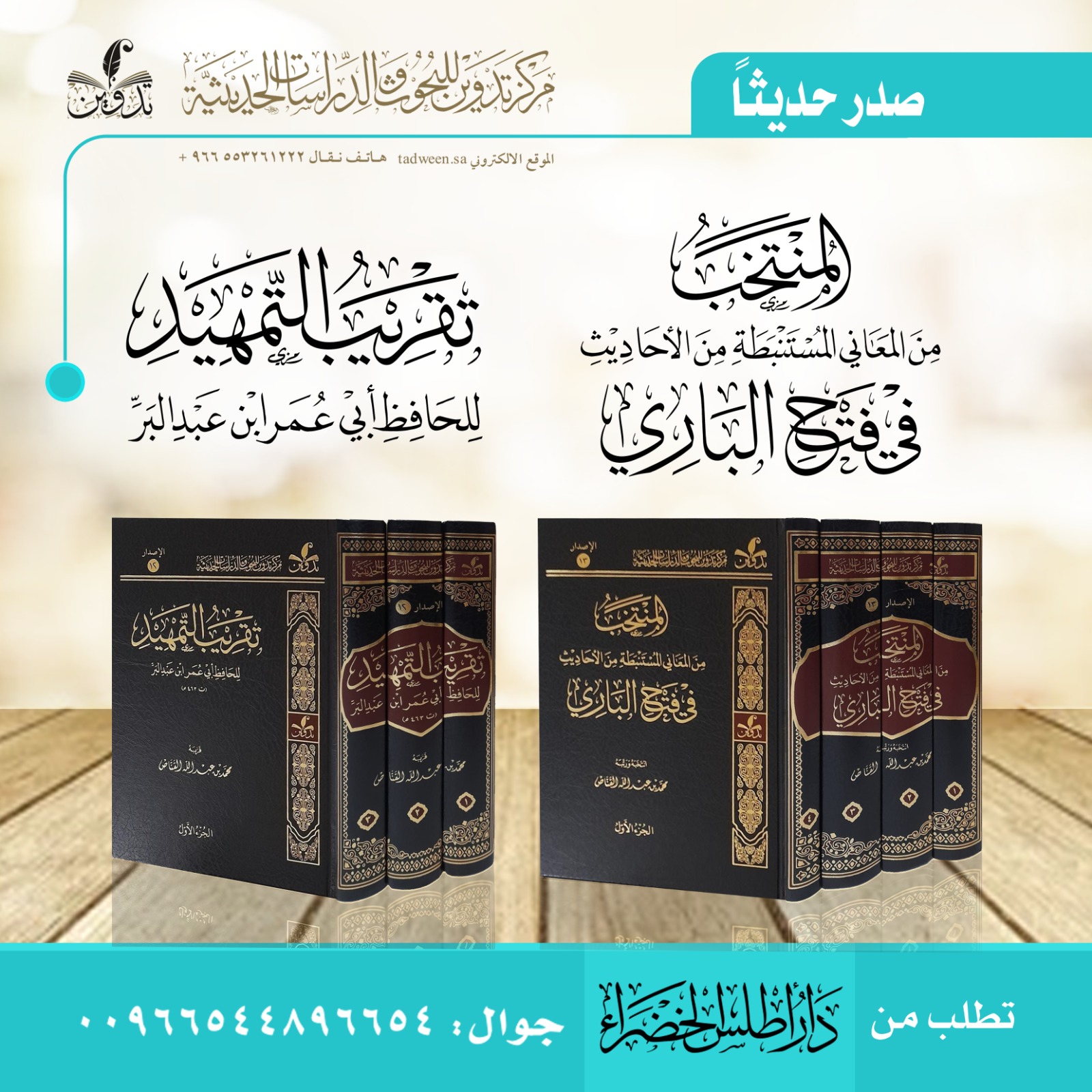 أصدر المركز: المنتخب من المعاني المستنبطة من فتح الباري 4ج - تقريب التهذيب للحافظ أبي عمر ابن عبد البر 3ج. انتخاب وتقريب فضيلة الشيخ الأستاذ الدكتور: محمد بن عبد الله القناص حفظه الله.